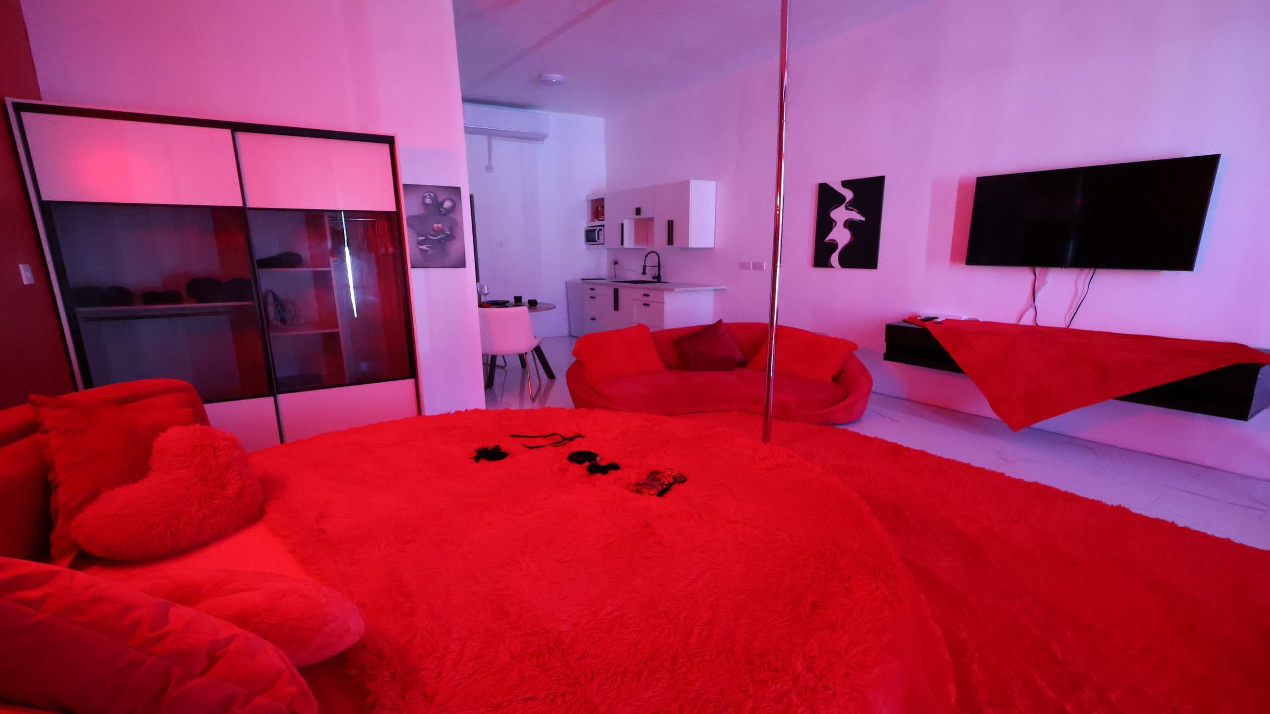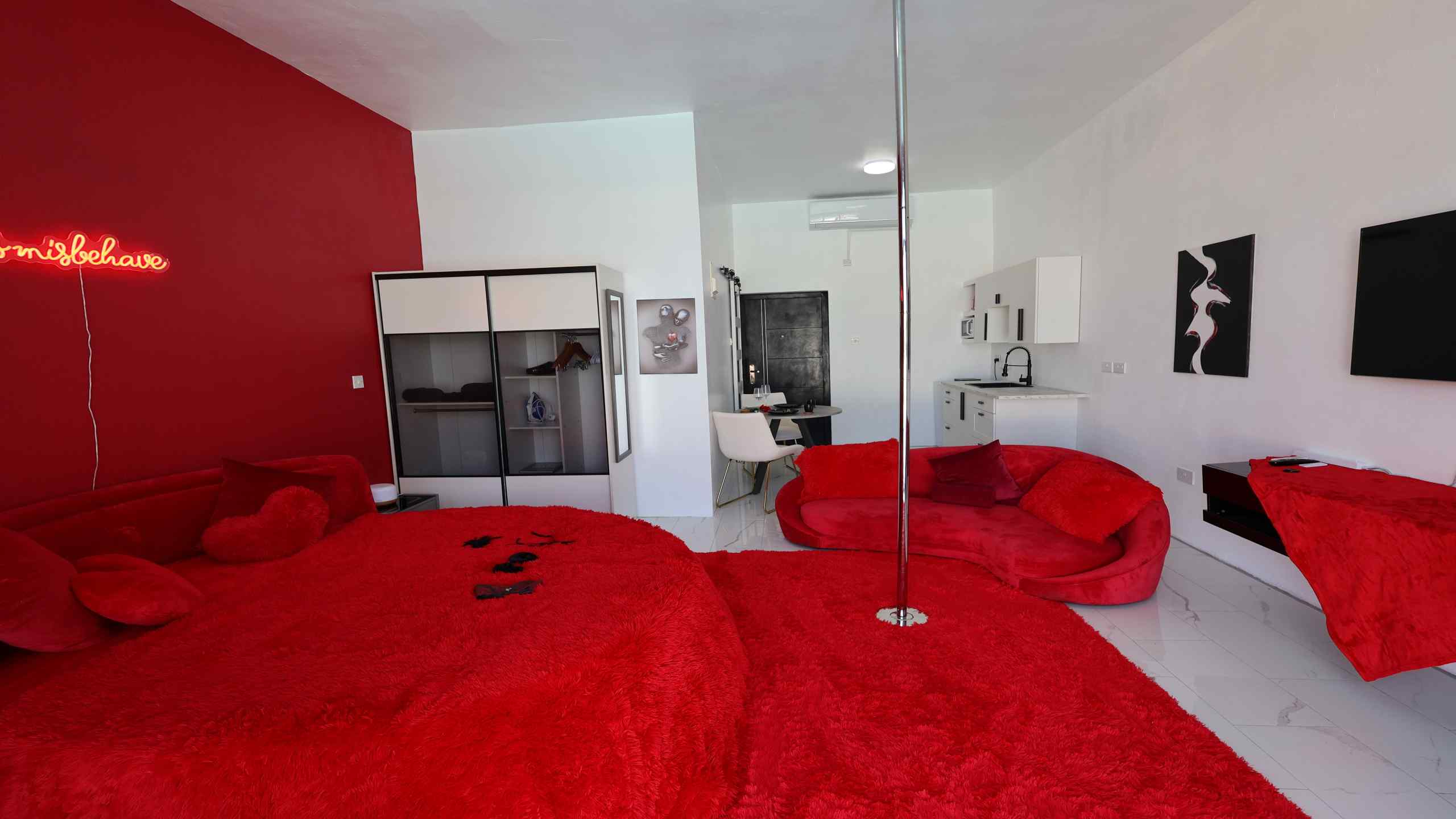 Celebrate love in style at the PÀRIS Honeymoon Suite, a beautifully designed retreat made for newlyweds and couples seeking an unforgettable romantic getaway. Elegant red décor, ambient lighting, and a plush round bed create an atmosphere of intimacy and indulgence, while the suite’s refined layout ensures both comfort and privacy.